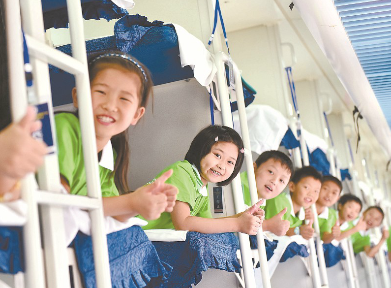 暑期,80余名来自重庆市綦江区的留守儿童乘坐K201次列车前往广州与父母团聚。列车工作人员对他们一路重点照顾,并开展互动表演等活动,车厢内充满了欢声笑语。图片摄影:余中华