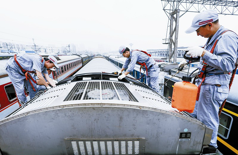合肥车辆段库检作业人员对列车空调机组进行检修。图片摄影:房斌
