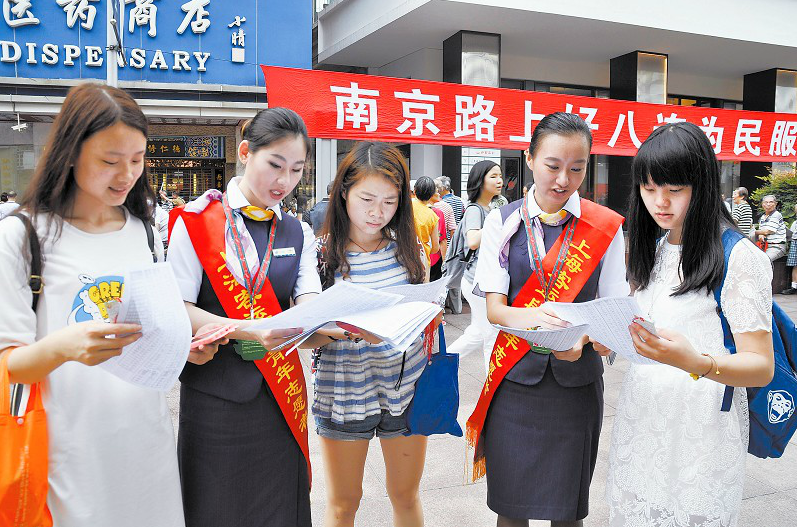 上海客运段高铁二车队组织青年志愿者走上街头,在南京路步行街向市民介绍暑运动车组列车开行信息,并发放简明时刻表。 图片摄影:张锦渭