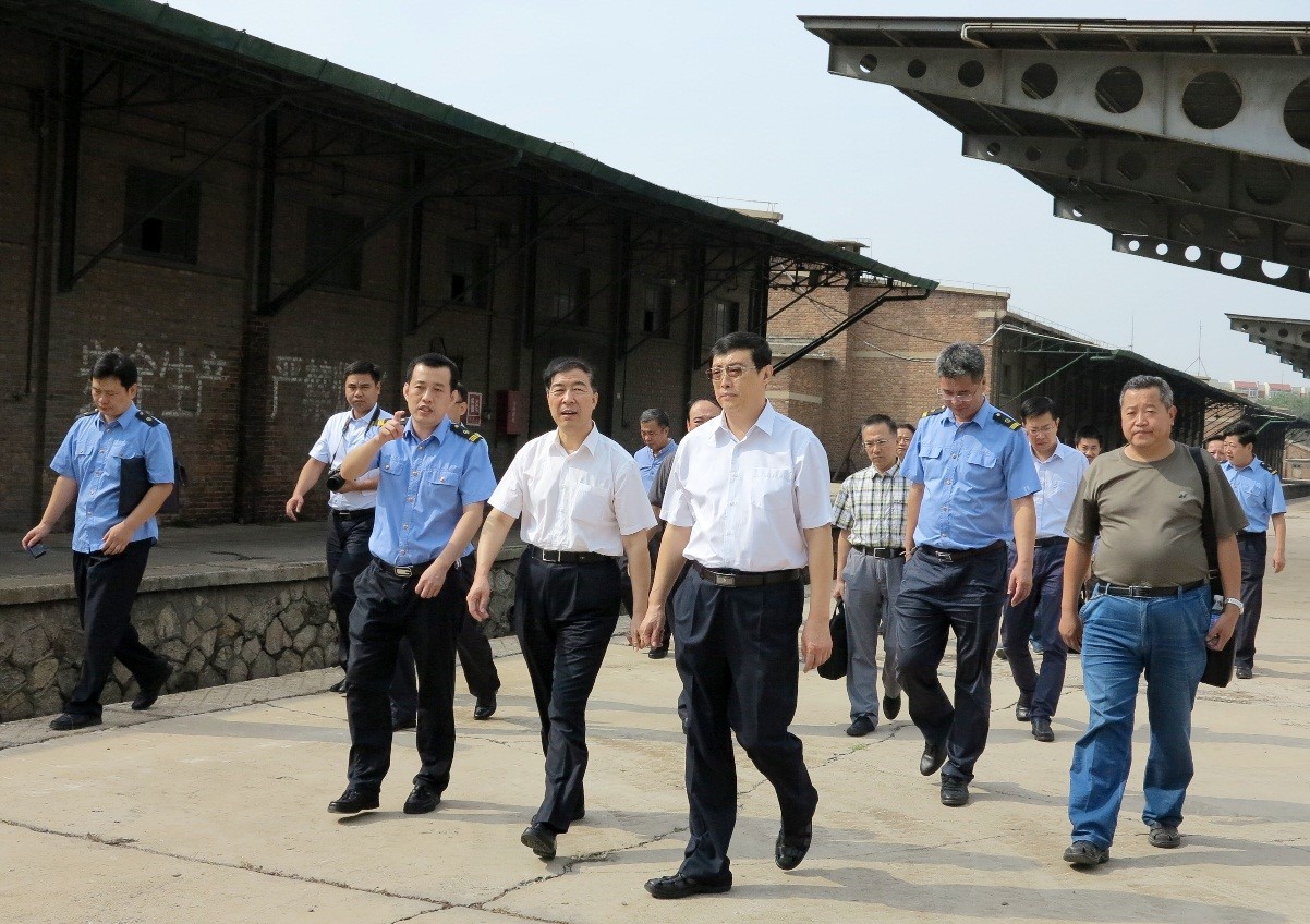 图为局党组成员、副局长傅选义(左四)在北京铁路局所属的爆炸品、剧毒品和放射性物品办理站张贵庄站检查专项整治开展情况。