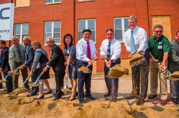 9月3日,中国中车股份有限公司美国马萨诸塞州斯普林菲尔德生产基地举行奠基仪式。这是中国轨道交通设备制造商首次在发达国家投资建厂,也是中国生产的地铁机车首次打入有着严苛安全技术标准的美国市场。这标志着中国铁路装备行业正在从产品输出向资本输出、技术输出,从产品合作向产品、技术、服务、管理全方位合作的转变。图为出席中国中车股份有限公司在美制造基地奠基仪式的嘉宾铲土奠基。