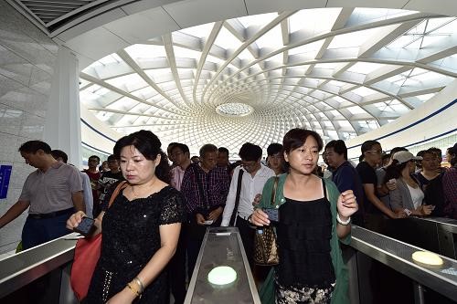 9月20,正线全长44.75公里的京津城际铁路延伸线——天津站至于家堡站开通运营。延伸线开通后,与京津城际铁路北京南站至天津站实现无缝连接,京津城际铁路全线可满足旅客在一小时内从北京到天津滨海新区于家堡中心商务区间往返直达运输需求。图为9月20日,旅客在于家堡站进站上车。