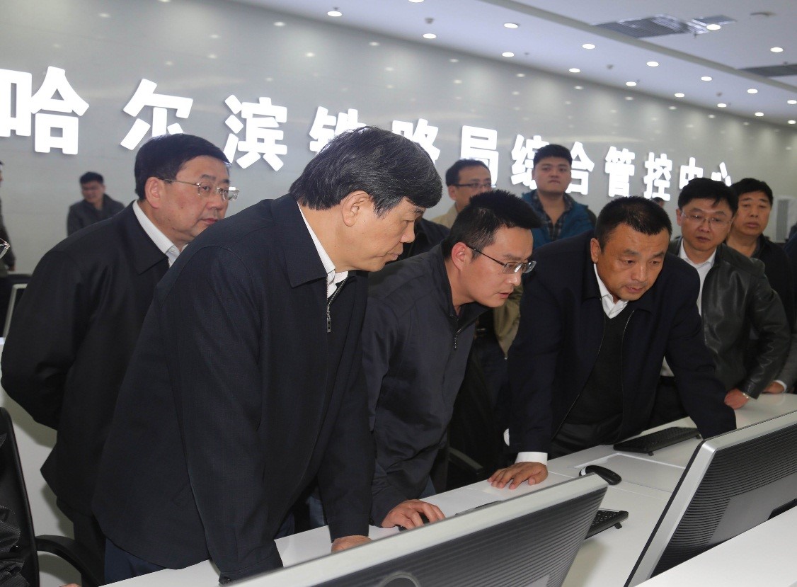 图为调研检查组在哈尔滨铁路局综合管控中心了解安全风险管控情况。