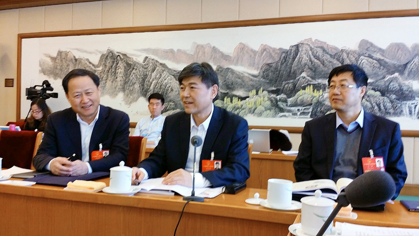 全国人大代表、国家铁路局上海铁路监督管理局局长唐士晟在参加第十二届全国人民代表大会第四次会议期间,认真学习、审议李克强总理所作政府工作报告。围绕推动新疆物流业转型升级,充分发挥新疆在推进“一带一路”建设中的核心区作用,向大会提交了“对新疆物流业发展给予特殊政策扶持,以促进新疆经济更快发展”的建议。图为全国人大代表、上海铁路监督管理局局长唐士晟(中)参加新疆代表团审议《政府工作报告》。