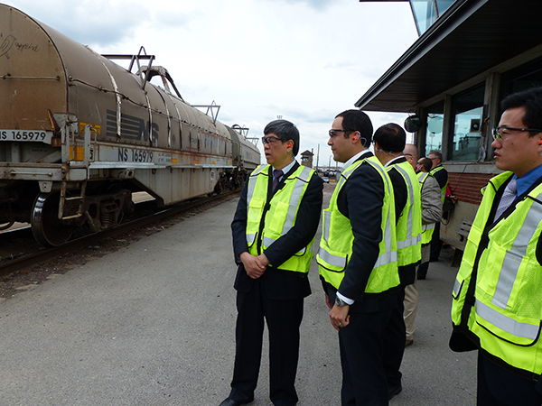 图为陆东福局长(左一)在美国联合太平洋铁路公司芝加哥货场了解货运组织情况