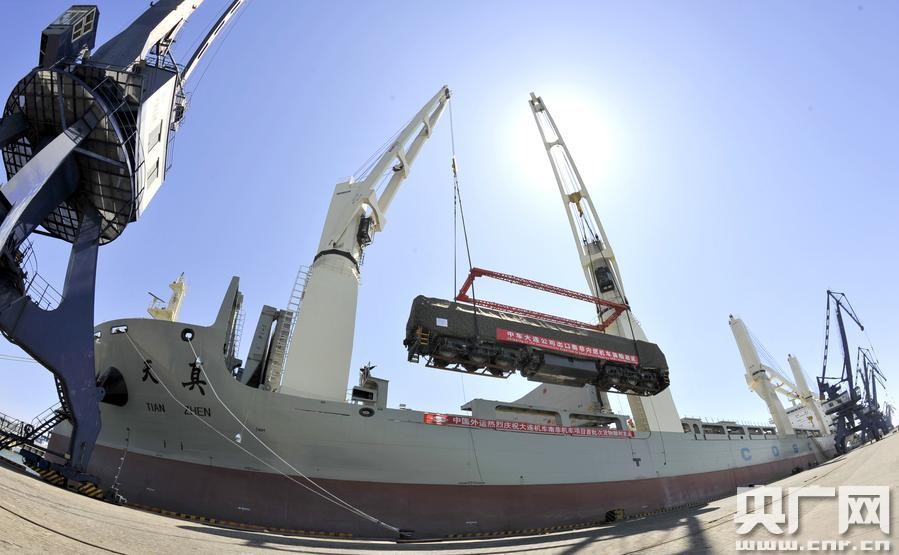 5月19日,我国内燃机车出口最大订单的首批机车,在大连湾码头装船启运。两台机车将穿越南海和印度洋,沿着通往非洲的“21世纪海上丝绸之路”完成首航南非之旅,计划6月下旬抵达南非德班港。2014年,中车大连机车车辆有限公司与南非国有运输集团签订了232台、总额约9亿美元的内燃机车供货合同,是我国内燃机车出口海外最大的单笔订单。