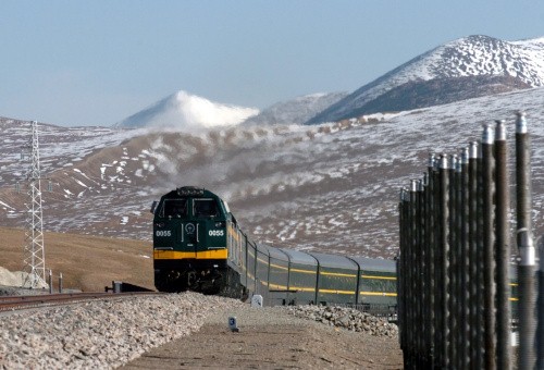 一列进藏列车经过昆仑山冻土热棒试验区。青藏铁路建设工程采取热棒、碎石护坡等多种技术措施有效保护了沿线冻土环境。 新华社记者 侯德强 摄