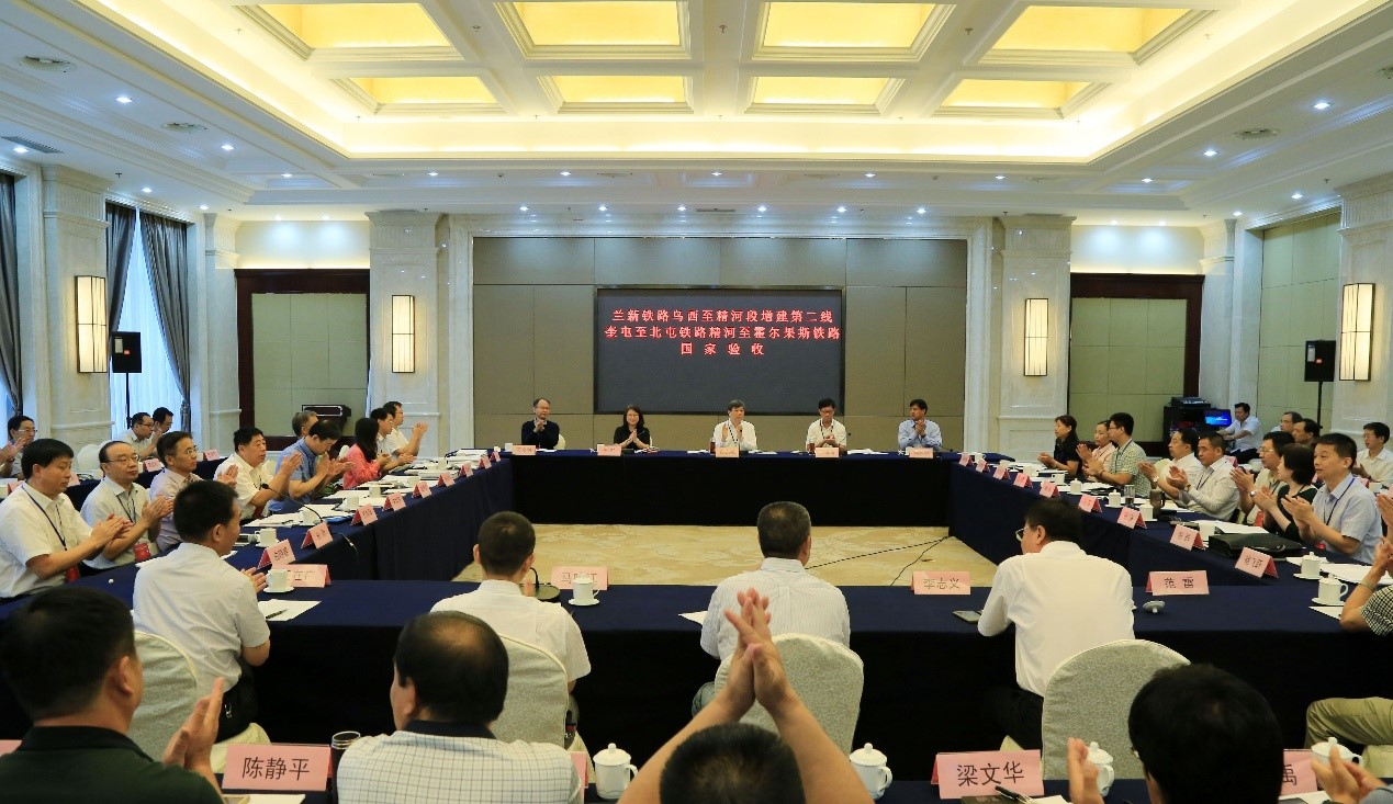 8月23日至26日,国家验收委员会对兰新铁路乌西至精河段增建二线工程(以下简称“乌精二线”)、新建奎屯至北屯铁路(以下简称“奎北铁路”)、新建精河至霍尔果斯铁路(以下简称“精霍铁路”)等三个铁路建设项目进行了国家验收。8月26日上午,国家验收委员会主任委员、交通运输部副部长、国家铁路局局长陆东福主持召开验收委员会会议讨论通过国家验收证书并作总结讲话。图为验收委员会一致同意三个项目通过国家验收。