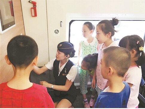 在G605次“晋之星”列车上,乘务员耐心地给小旅客讲解安全知识。杨娜 摄(图片来源:人民铁道报)