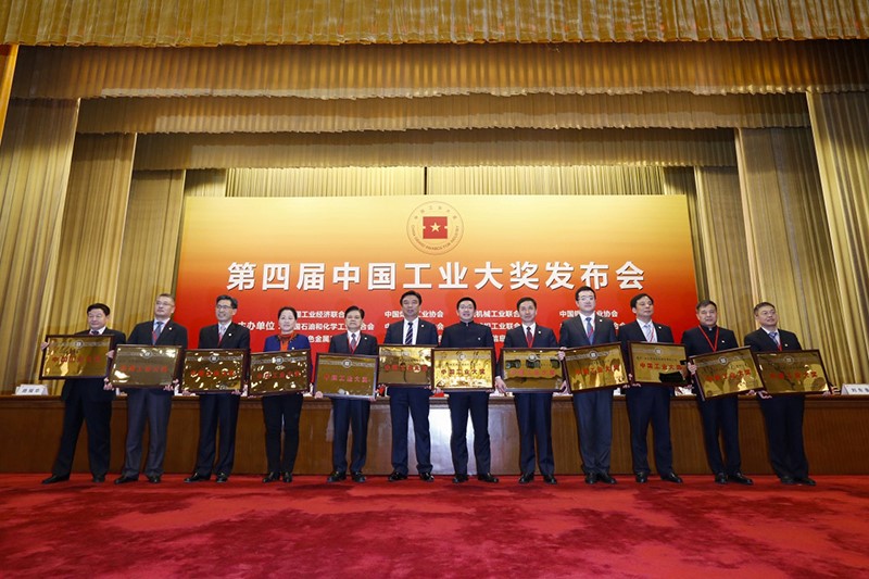 获得中国工业大奖的企业代表展示奖牌。