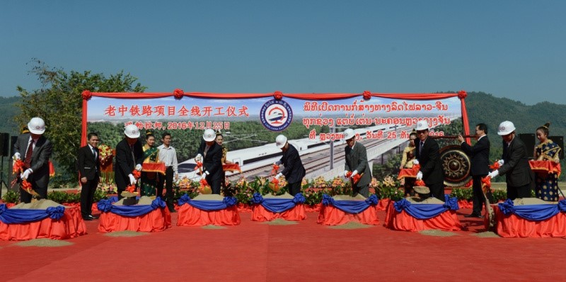 12月25日,中老铁路全线开工仪式在老挝琅勃拉邦举行,老挝总理通伦和中国驻老挝大使关华兵等出席开工仪式。中老铁路北起两国边境磨憨—磨丁口岸,南至万象,全长417公里,为Ⅰ级单线铁路,设计时速160公里/小时,预计建设期为5年。中老铁路建成后将与中国铁路网直接连通,对中国与东盟铁路互联互通具有重要意义。图为开工仪式现场。