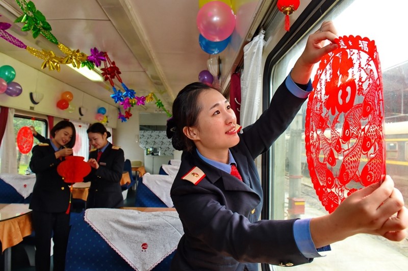 福州客运段乘务员在福州开往广安的农民工专列上布置餐车。张国俊 摄
