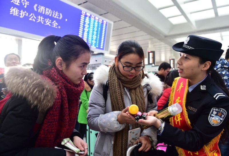 公安民警在合肥南站向旅客介绍哪些物品禁止携带上车。刘军喜 摄