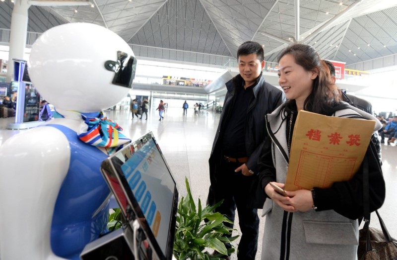 旅客在西安北站使用智能机器人查询乘车信息。李一博 摄