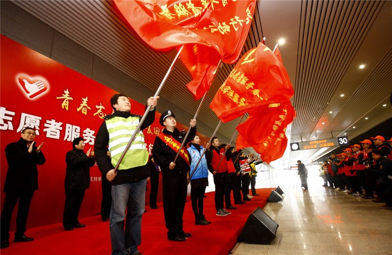 中国青年志愿者服务春运“暖冬行动”2017年启动仪式在铁路上海虹桥站举行。青年志愿者将开展引导咨询、秩序维护、重点帮扶和应急救援等志愿服务。方喆 摄