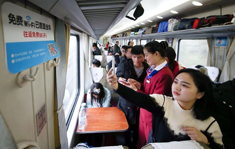北京西至井冈山的Z133次旅客列车上,旅客用手机扫描免费WiFi二维码。张学东 摄