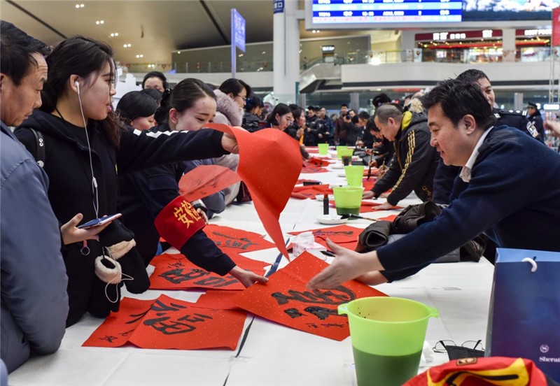 中国文联、中国美协的书画家在乌鲁木齐站候车大厅,为广大旅客写“福”送“福”。赵戈 摄