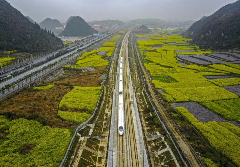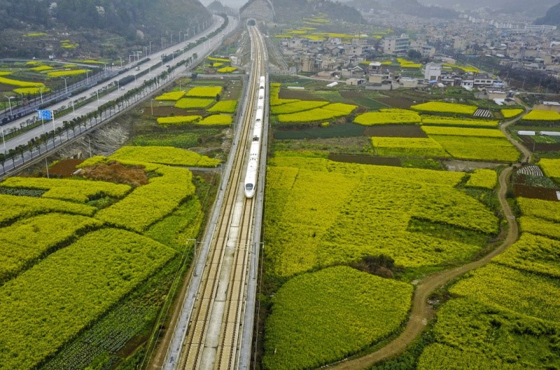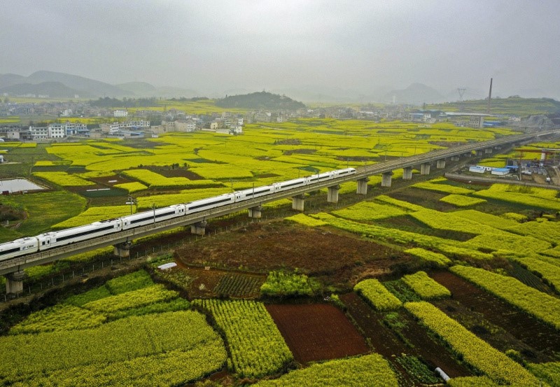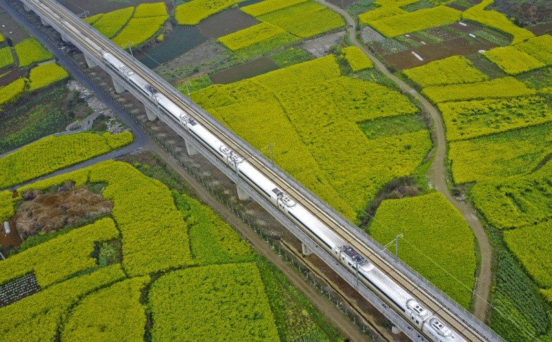 近日,贵州安顺油菜花开,高铁列车穿行其间,构成一幅幅美丽图画。图为3月16日,一列动车组列车在沪昆高铁贵州安顺段行驶。