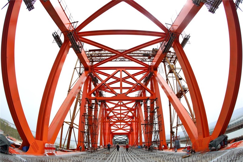 4月17日,由中国中铁大桥局承建的京张高铁官厅水库特大桥进行第一孔钢梁顶推施工。图为京张高铁官厅水库特大桥施工现场。
