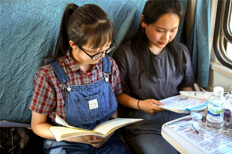 参加高考的学生们在“高考专列”上抓紧时间备考。