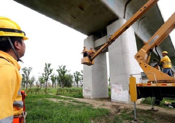 高温天气,铁路桥梁有时会“患上”混凝土掉块、钢筋外露等影响设备使用寿命的“疾病”,这也是桥梁工们最为辛苦的时候。图为上海工务段桥梁工正在对丹昆特大桥进行区段检修维护。(图片来源:人民网)