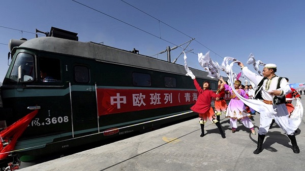8月20日,青海省首次发往俄罗斯彼尔姆市的中欧班列从青藏铁路公司格尔木车站驶出。班列行程约6360公里,预计用时10天左右,运载的货物为青海柴达木盆地循环经济示范区生产的盐湖产品。图为群众载歌载舞为中欧班列送行。