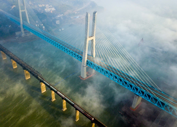新白沙沱长江特大桥全线长约5.32公里,其中主桥全长920米,是渝贵铁路跨越长江的重要通道和关键控制性工程。该桥上层为四线客车线,设计时速200公里;下层为两线货车线,设计时速120公里。据介绍,渝贵铁路开通后,列车通过这座大桥最快仅需16.56秒。图为新白沙沱长江特大桥(后)和修建于20世纪50年代的白沙沱长江大桥(前)。