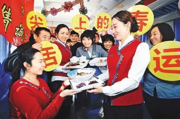 Z317/8次列车日前推出“中式快餐”列车微信点餐服务,旅客只需打开微信扫一扫,对准列车车厢内小桌上的二维码扫码关注公众号,即可进入点餐系统,让旅客在旅途中也能享受“舌尖”上的春运。(来源:人民日报)