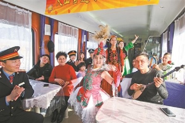 Z69次列车贯彻“平安春运、有序春运、温馨春运,让旅客体验更美好”的春运工作新理念,开展新服务——新疆特色歌舞表演。(来源:人民铁道)
