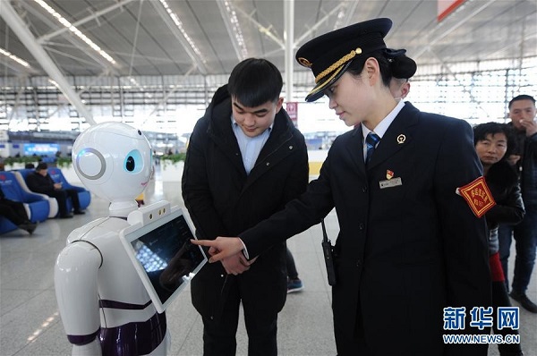青岛北站工作人员向旅客介绍问询机器人“小路”。近日,一台集合人机交互、人工智能、大数据等多项新技术的问询机器人“小路”亮相山东青岛北站候车室,为旅客提供车次、检票口、餐饮、问路指引等多项语音问询及查询服务,为春运中的旅客带来便利。(来源:新华社)