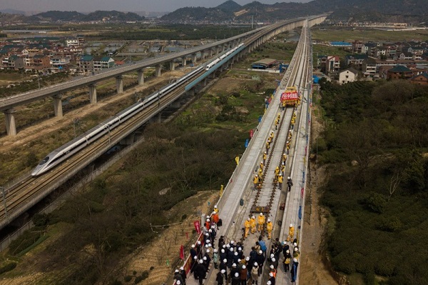 中铁四局施工技术人员在传芳特大桥上进行杭黄铁路的铺轨作业,一列高铁从旁边的沪昆客运专线上驶过。