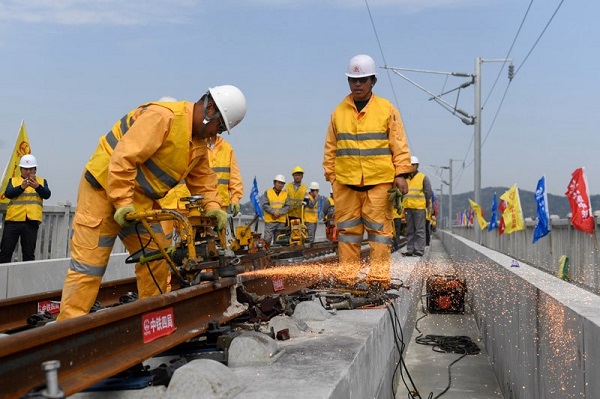 3月12日,在浙江省杭州市萧山区的传芳特大桥上,中铁四局顺利铺下最后一对500米长钢轨,铝热焊机完成最后一对轨头焊接,标志着杭州至黄山铁路客运专线轨道全线贯通。