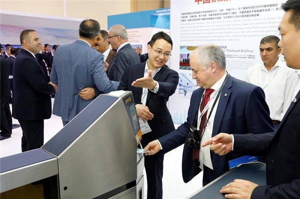 观众在国际高铁大会上体验中国铁路检票闸机。