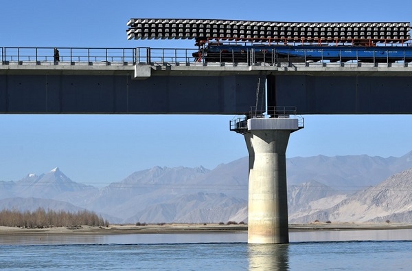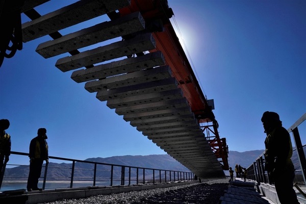 施工人员在川藏铁路拉林段贡嘎雅鲁藏布江特大桥上铺轨。