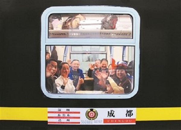 旅客在加开列车上挥手致意。(来源:人民铁道网)