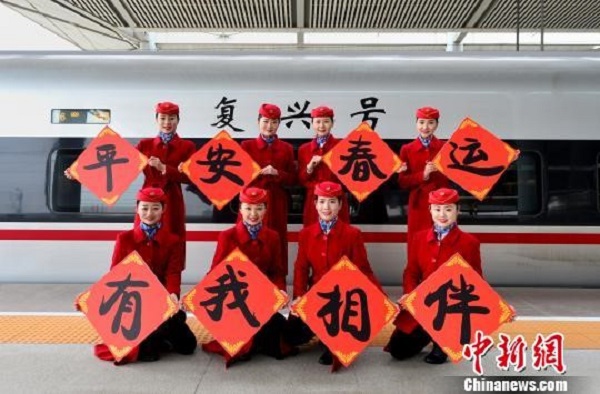 合肥客运段工作人员在G266次列车上为旅客送“福”字。(来源:新华社)