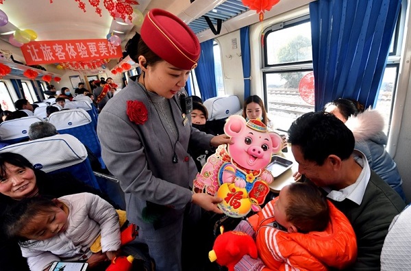 在贵阳北开往宁波的G2334列车上,乘务员为旅客送上春联、福字挂历和生肖猪玩偶等新年礼品。(来源:新华社)