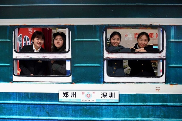 郑州火车站在站内开设“百年郑站时光机”,体验者穿着不同时期的铁路职工工作服在“绿皮车”造型展板前留影。(来源:新华社)