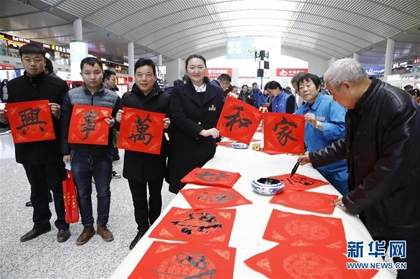 山东济南西站职工和旅客手举“家和万事兴”的书法作品合影留念。(来源:新华社)