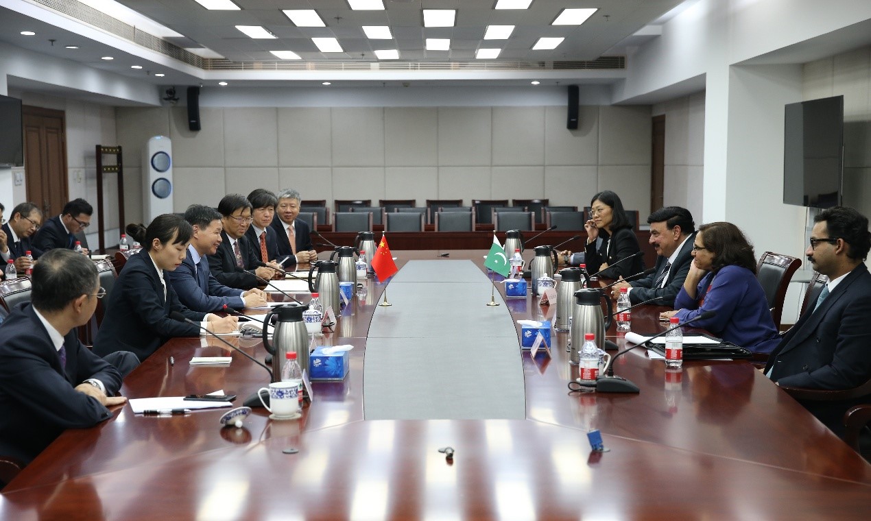 10月10日,国家铁路局副局长安路生(左三)在北京会见了巴基斯坦铁道部长拉希德(右三)和巴基斯坦驻华大使哈什米(右二)。双方就进一步推进巴基斯坦1号铁路干线项目等合作事宜进行了深入友好的交谈。