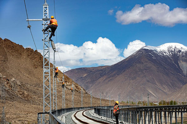 目前,由中铁电气化局集团承建的拉林(拉萨至林芝)铁路泽当至桑日段电气化施工有序推进,接触网支柱已组立完成,腕臂安装全面展开。拉林铁路正线全长435.48公里,设计时速160公里,是西藏首条电气化铁路。图为中铁电气化局集团员工在海拔3560米的绒乡特大桥上进行电气化施工。