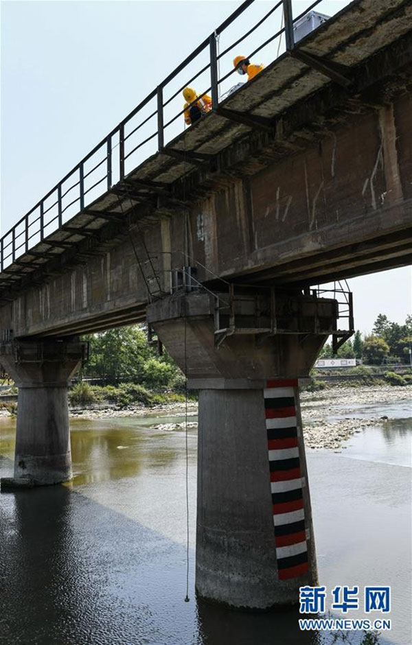 在成都市蒲阳河1号桥,技术人员使用测深仪测量桥下河流深度。