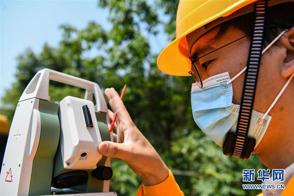 在成都市蒲阳河1号桥,技术人员在调试全站仪。