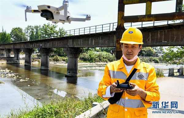 在成都市蒲阳河1号桥,技术人员操作无人机准备进行铁路桥的防洪隐患排查。
