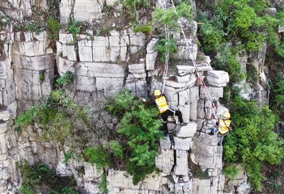 在太行山深处的中国铁路郑州局集团有限公司月山工务段,有一群被称为捅山工的人。每年汛期来临前,他们都要对山体进行检查、清理,在悬崖峭壁间“行走”,挥动手中的钢钎,排除威胁铁路行车安全的危石。图为日前,捅山工正在排除危石。