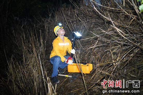 5月底以来,受高空槽、切变线和地面弱冷空气影响,广西北部地区连续出现暴雨山洪,局地还有大暴雨到特大暴雨,影响高铁正常运行秩序。广西高铁运营维护部门以雨为令,全员上线参战,全时段加强防洪重点地点和重要设备雨中雨后检查力度,全力应对超强降雨,确保主汛期高铁运输安全畅通。图为铁路工人正在调整灯光位置,确保检查效果。伍光钦 摄