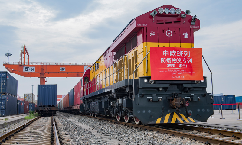 8月12日,75061次中欧班列(西安—米兰)满载口罩和熔喷布,从中国铁路西安局集团新筑车站出发,驶向意大利米兰。自新冠疫情发生以来,中欧班列(西安)共运输防疫物资1521车,共计12719.6吨,为开展国际防疫合作提供了有力支持。