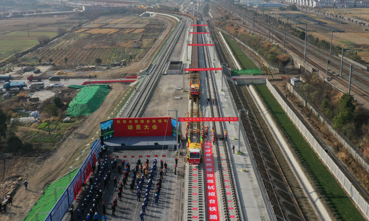 2月1日,在浙江临海的杭绍台铁路建设施工现场,首对500米长钢轨被安全平稳地铺设到无砟轨道道床上,标志着杭绍台铁路工程转入全线铺轨阶段。