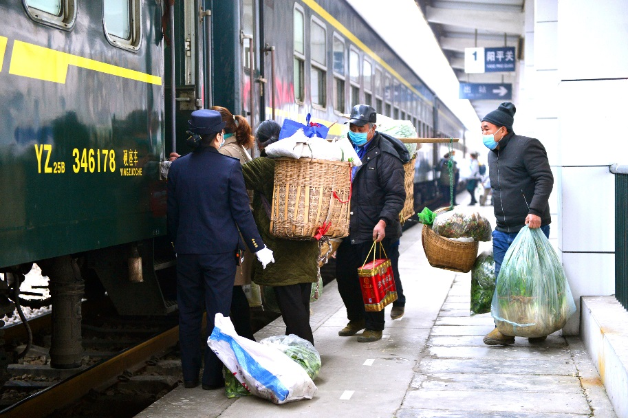 赵明英所在的“惠农车厢”,四壁挂满了沿线各种土特产的照片和介绍,是6063/4次列车的一道特殊风景。列车途经13个车站,其中不少是日均客流量不足2000人却是山民唯一远行出口的四等小站。一边是山里人要讨生活,一边是城里人想尝鲜,中国铁路西安局集团有限公司一拍板:“搭桥!”按铁路规定,超过25公斤的包裹行李需交运费,考虑到老乡们都生活在集中连片特困地区,西安局再拍板:“全免!”