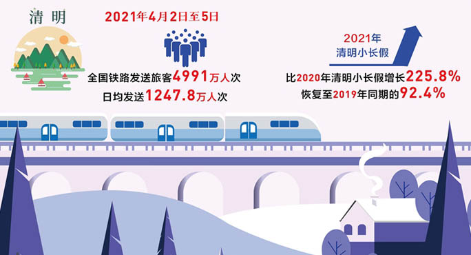 为期4天的铁路清明小长假运输圆满收官。4月2日至5日,全国铁路发送旅客4991万人次,日均发送1247.8万人次,比2020年清明小长假增长225.8%,恢复至2019年同期的92.4%。